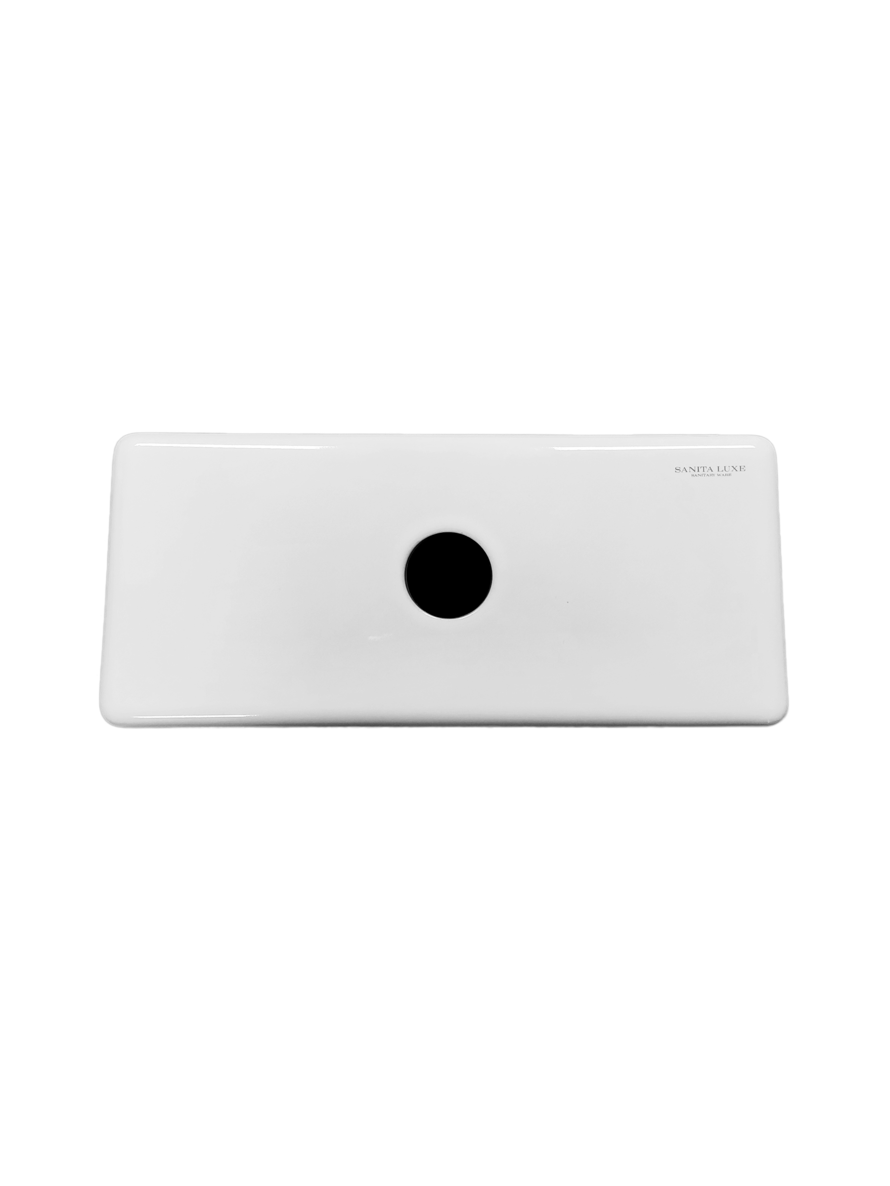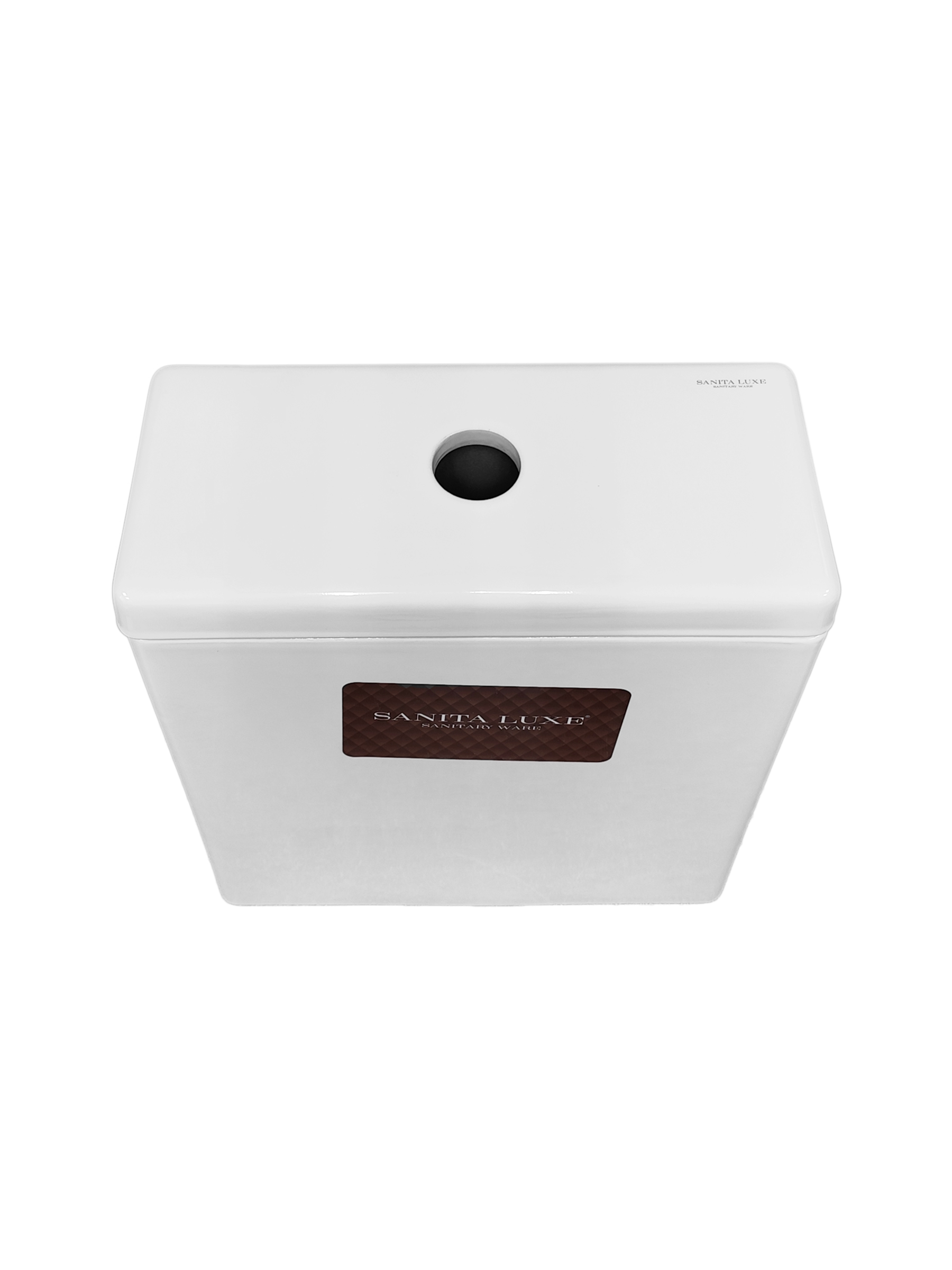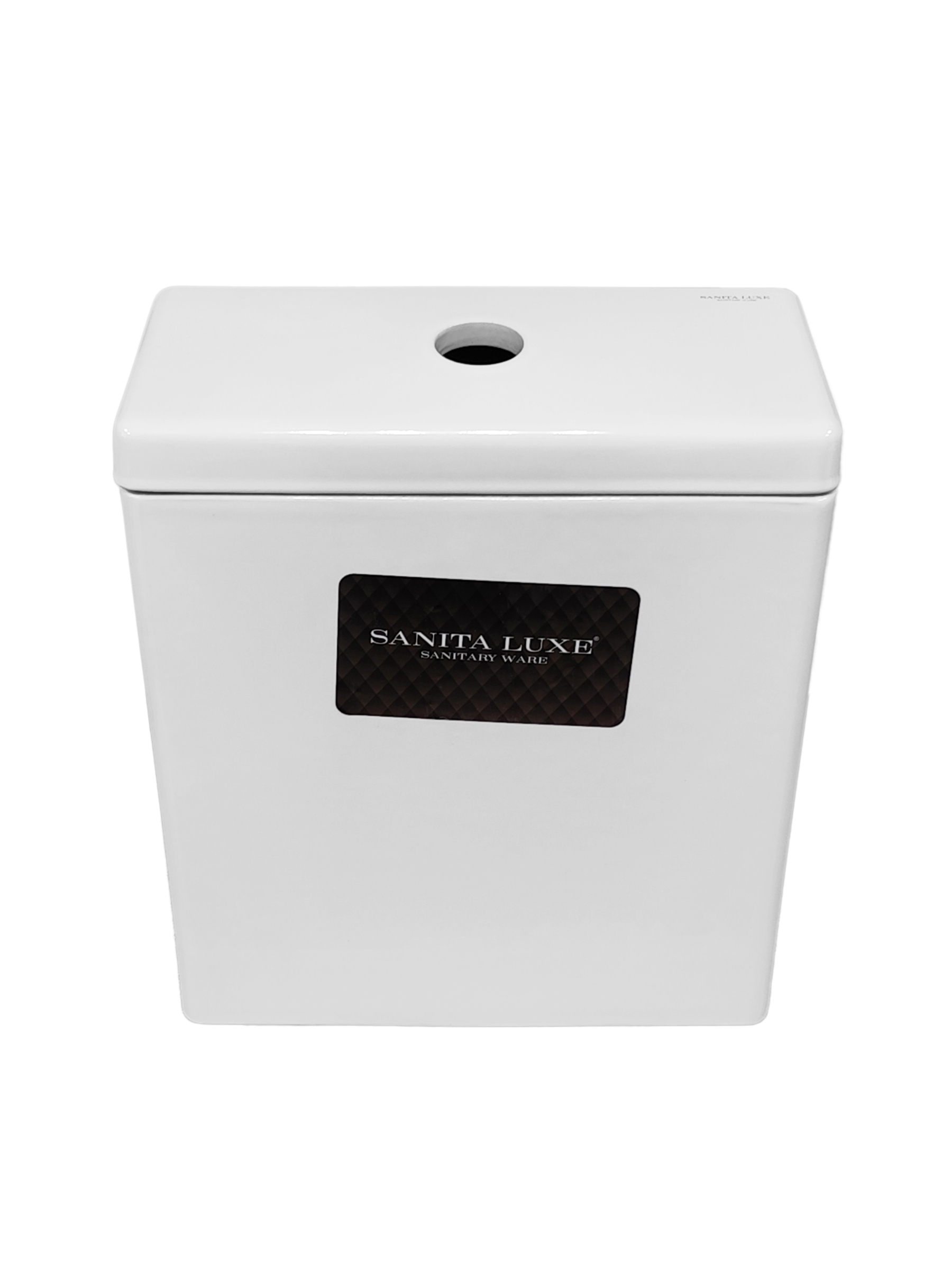 Белый керамический смывной бачок с крышкой для унитаза Sanita Люкс КВАДРО с ПРАВЫМ нижним подводом воды и расстоянием между креплениями 140 мм, без арматуры.